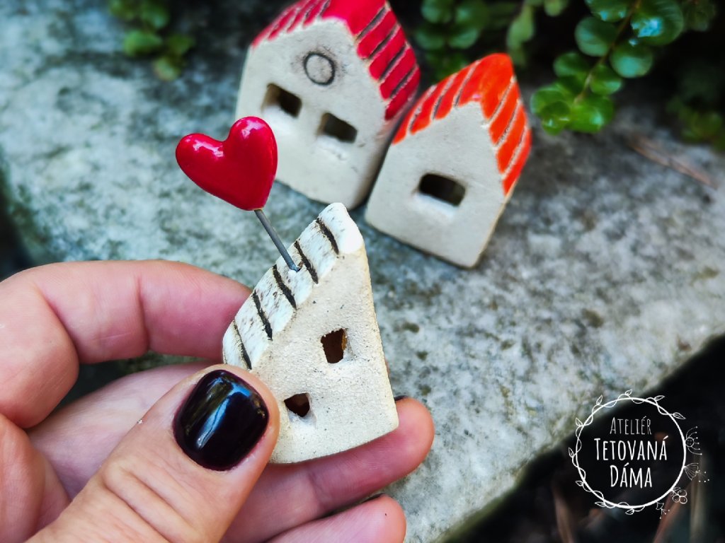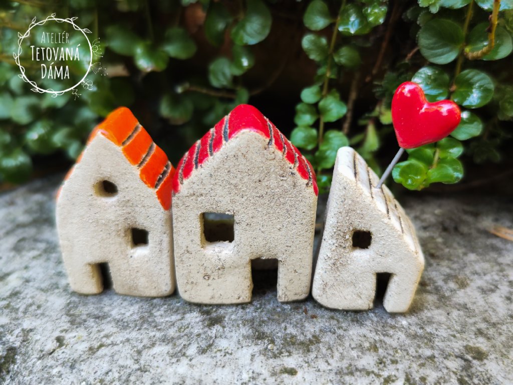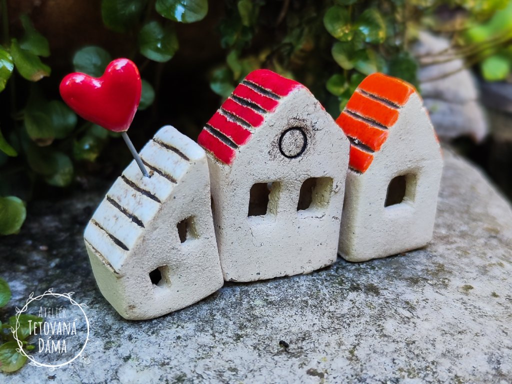 Sada malých keramických domečků z hrubé šamotové hlíny. Tónované jsou zatřeným burelem (oxidem mědi) a detaily mají glazovány stálými barevnými glazurami. Jsou duté, takže jsou brouk-friendly. Slušet budou nejen podzimním dekoracím s listopadkami nebo vřesy, ale vesele budou vyhlížet i u dekoracích letních nebo se skalničkami.