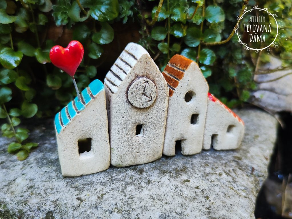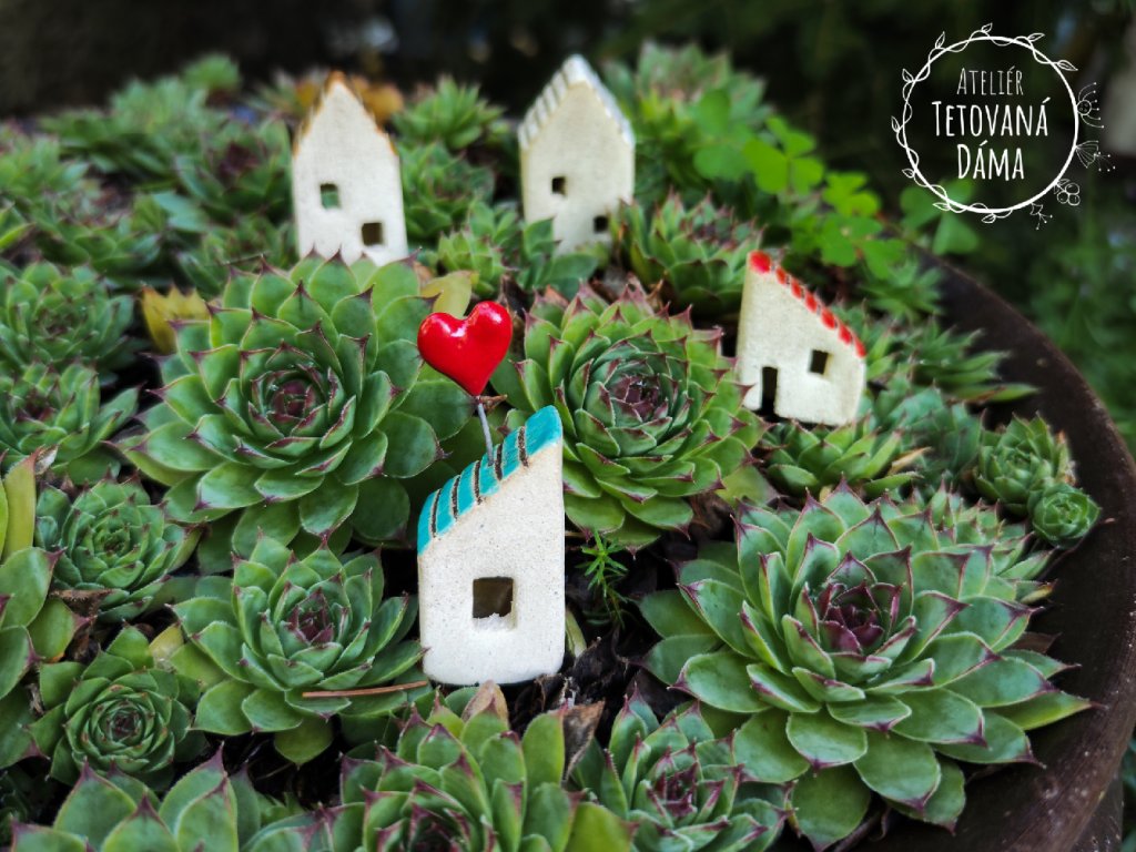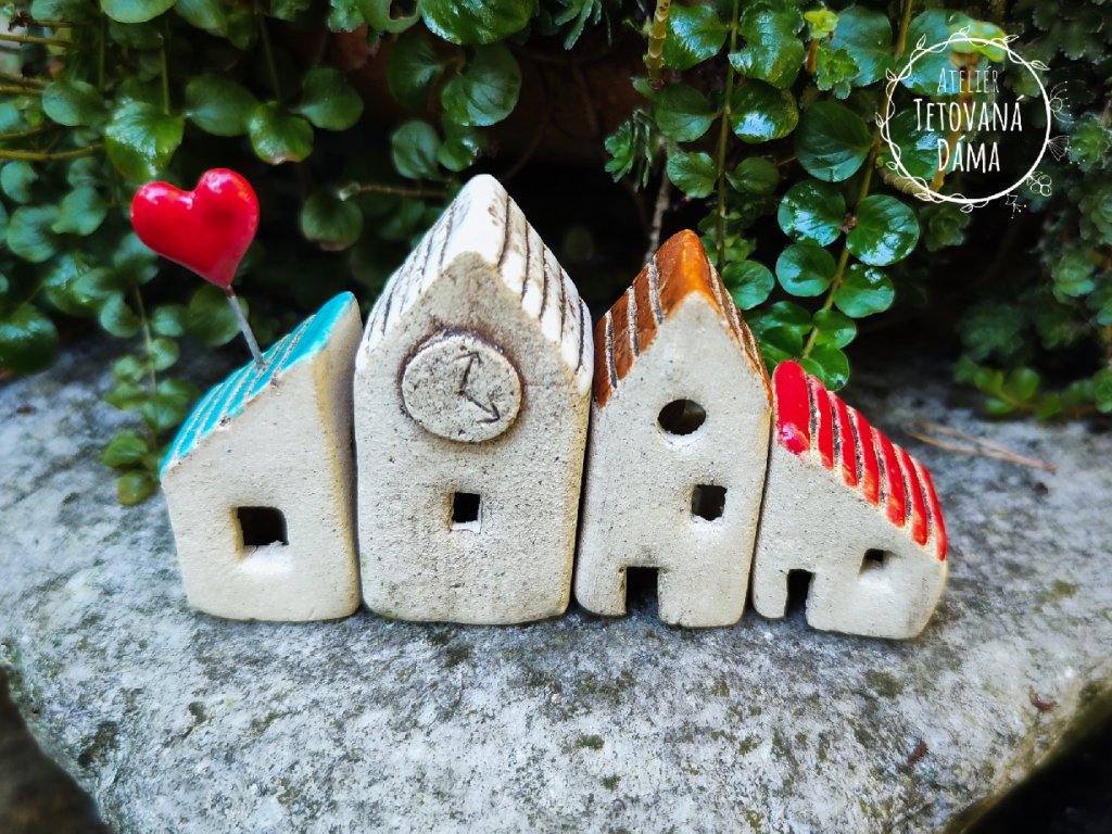 Sada malých keramických domečků z hrubé šamotové hlíny. Tónované jsou zatřeným burelem (oxidem mědi) a detaily mají glazovány stálými barevnými glazurami. Jsou duté, takže jsou brouk-friendly. Slušet budou nejen podzimním dekoracím s listopadkami nebo vřesy, ale vesele budou vyhlížet i u dekoracích letních nebo se skalničkami.
