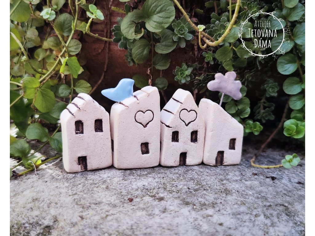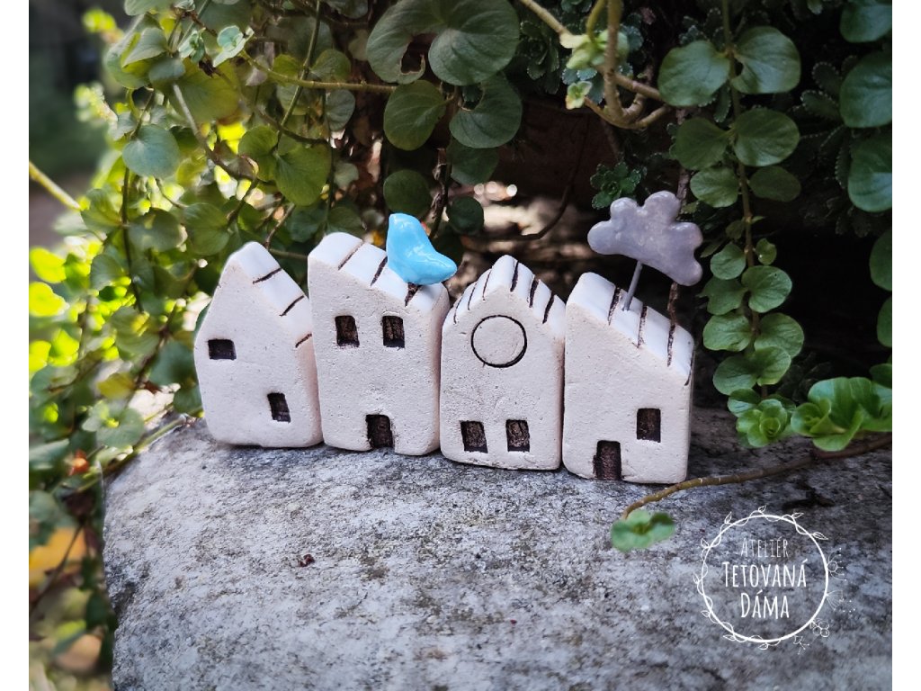 Sada malých keramických domečků z hrubé šamotové hlíny. Tónované jsou zatřeným burelem (oxidem mědi) a detaily mají glazovány stálými barevnými glazurami. Keramická hlína je volena šamotová, která vydrží i nízké teploty. Domečky můžete mít v zahradě tedy po celý rok. Slušet budou nejen podzimním dekoracím s listopadkami nebo vřesy, ale vesele budou vyhlížet i u dekoracích letních nebo se skalničkami.