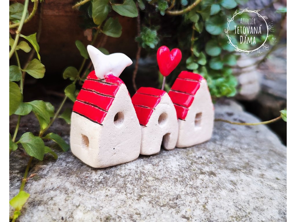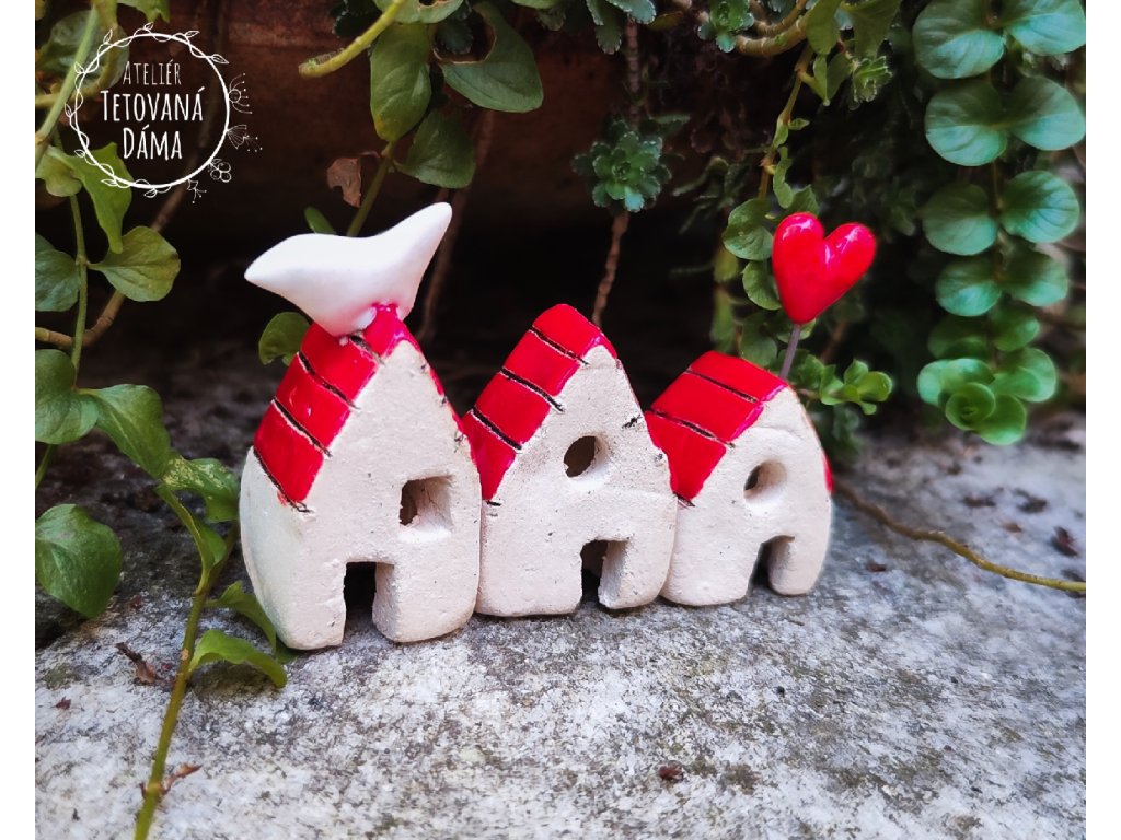 Sada malých keramických domečků z hrubé šamotové hlíny. Tónované jsou zatřeným burelem (oxidem mědi) a detaily mají glazovány stálými barevnými glazurami. Keramická hlína je volena šamotová, která vydrží i nízké teploty. Domečky můžete mít v zahradě tedy po celý rok. Slušet budou nejen podzimním dekoracím s listopadkami nebo vřesy, ale vesele budou vyhlížet i u dekoracích letních nebo se skalničkami.