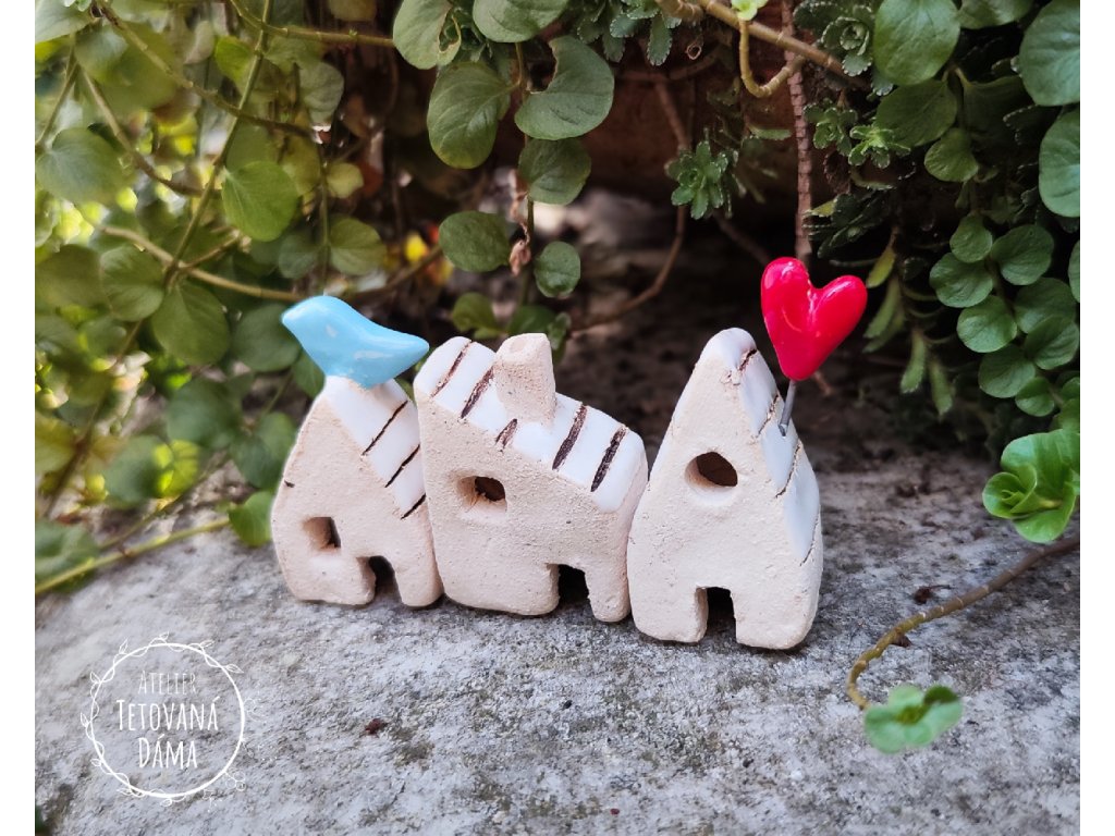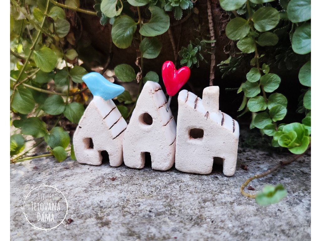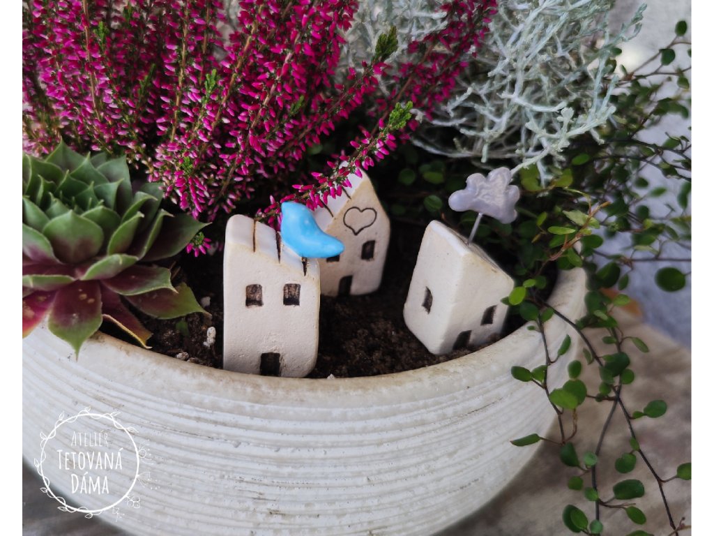 Sada malých keramických domečků z hrubé šamotové hlíny. Tónované jsou zatřeným burelem (oxidem mědi) a detaily mají glazovány stálými barevnými glazurami. Keramická hlína je volena šamotová, která vydrží i nízké teploty. Domečky můžete mít v zahradě tedy po celý rok. Slušet budou nejen podzimním dekoracím s listopadkami nebo vřesy, ale vesele budou vyhlížet i u dekoracích letních nebo se skalničkami.