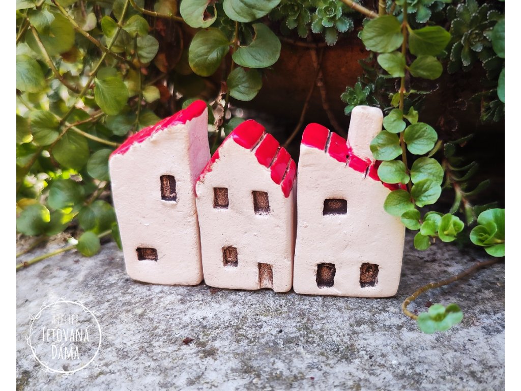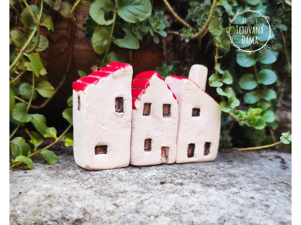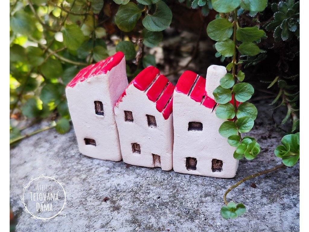 Sada malých keramických domečků z hrubé šamotové hlíny. Tónované jsou zatřeným burelem (oxidem mědi) a detaily mají glazovány stálými barevnými glazurami. Keramická hlína je volena šamotová, která vydrží i nízké teploty. Domečky můžete mít v zahradě tedy po celý rok. Slušet budou nejen podzimním dekoracím s listopadkami nebo vřesy, ale vesele budou vyhlížet i u dekoracích letních nebo se skalničkami.